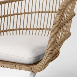 - White steel frame and beige wicker details make for a chic and bold aesthetic