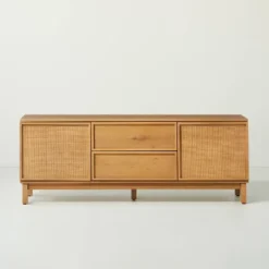Refresh your reading nook or home office in sleek style with this Wood and Cane Transitional Writing Desk from Hearth & Handâ„¢ with Magnolia. Crafted from wood, this rectangle writing desk has a natural finish to easily integrate into your existing decor style. Designed with a built-in drawer accented with decorative lattice, this writing desk offers ample space for your office supplies, lamp and more. Simply place this desk along the wall with a coordinating wooden chair to spruce up the look of your space.